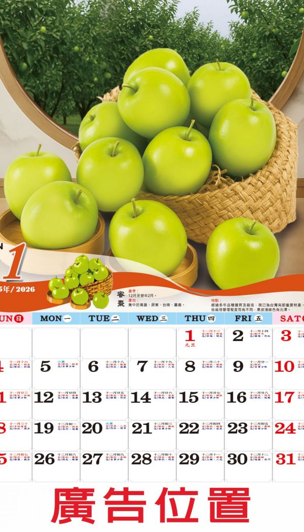 依季節呈現台灣代表性水果,記事欄位皆有農民曆,並保留足夠的記事位置。