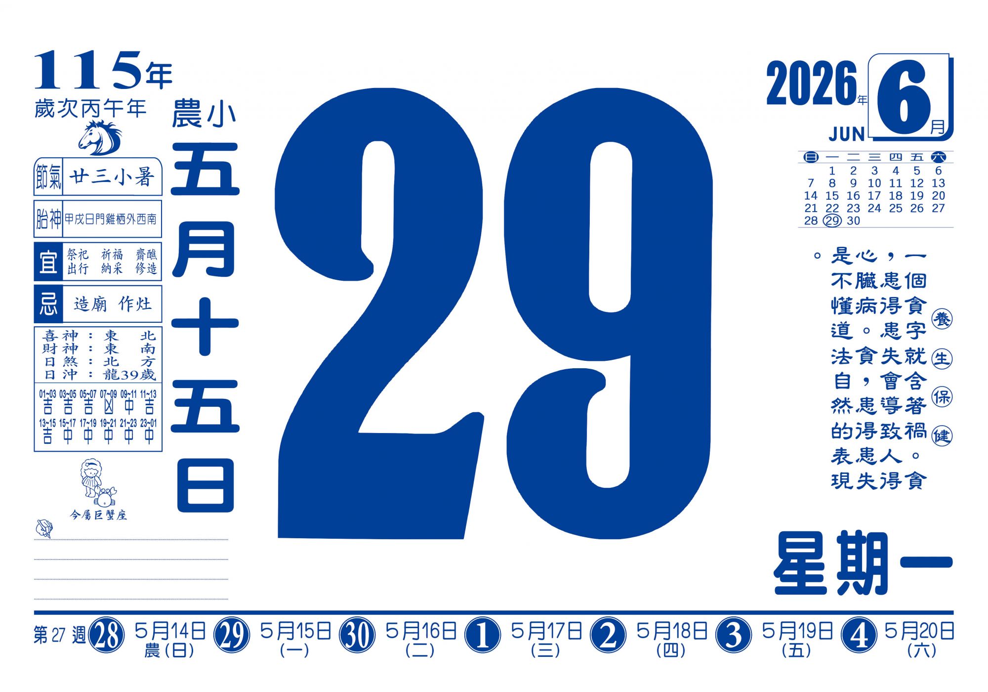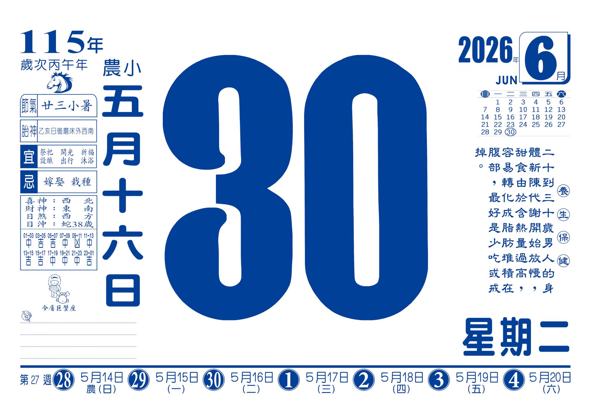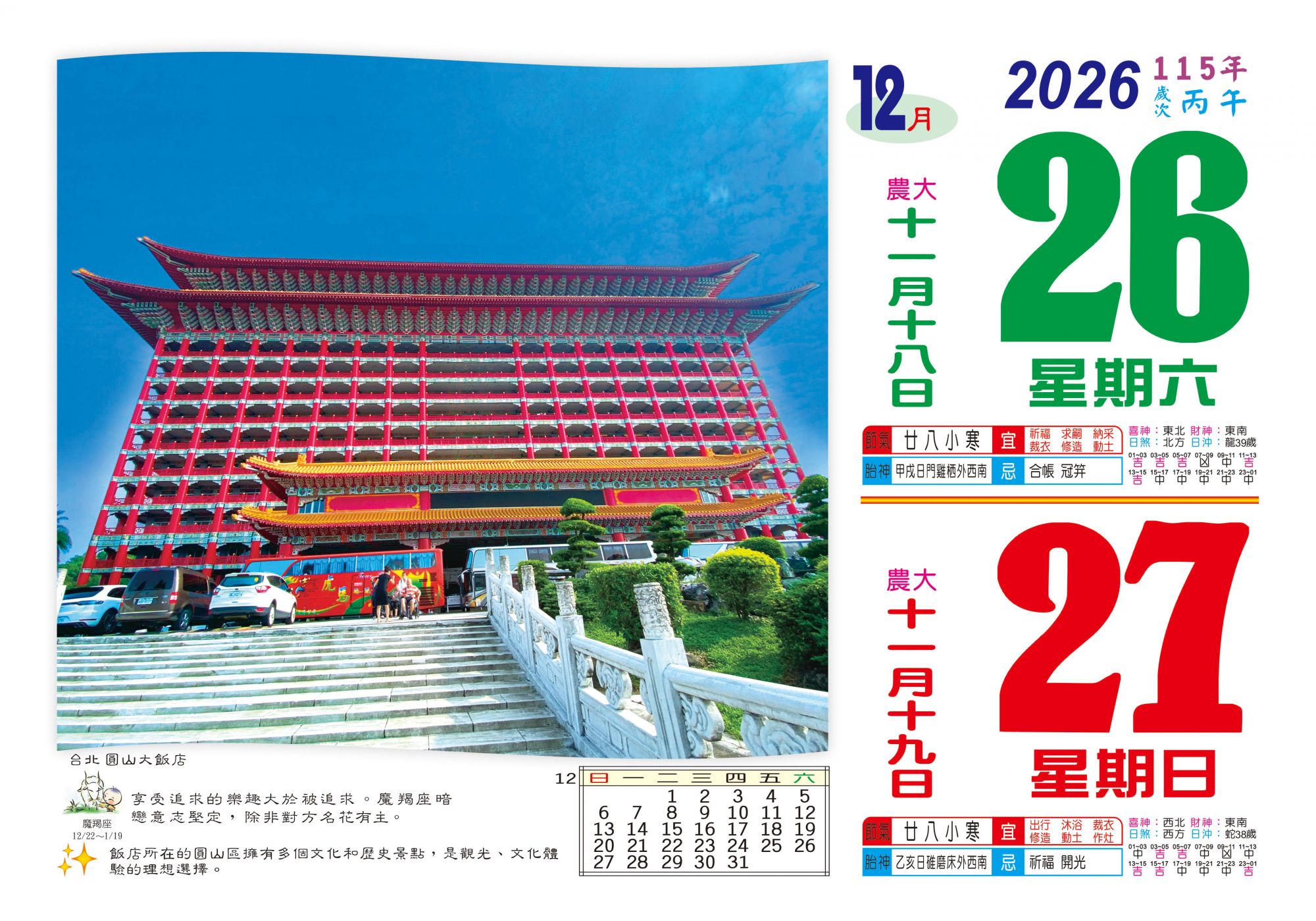 - 特色平日為大數字,閱讀清晰。下方列出一週週表,方便規劃行程;